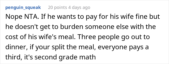 Recently a Redditor turned to the AITA community for advice, wondering if he was wrong to refuse to pay for half of his friend’s unemployed wife’s meals when they eat out.