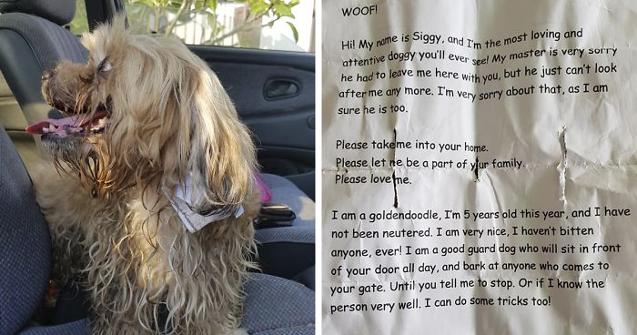 The note that was attached to Siggy read: “Hi! My name is Siggy, and I’m the most loving and attentive doggy you’ll ever see! My master is very sorry he had to leave me here with you, but he just can’t look after me anymore. I’m very sorry about that, as I am sure he is too.
