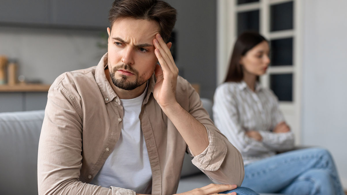 Man looking distressed while woman with crossed arms sits in background, reflecting on wife's cheating betrayal issues.