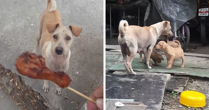 To the kind-hearted man’s surprise, the doggie didn’t eat it. She just took it and ran away. The guy decided to follow her through the city, and what he saw when she finally stopped was truly heart-melting. Turns out the canine brought the food home to her 4 hungry puppies.