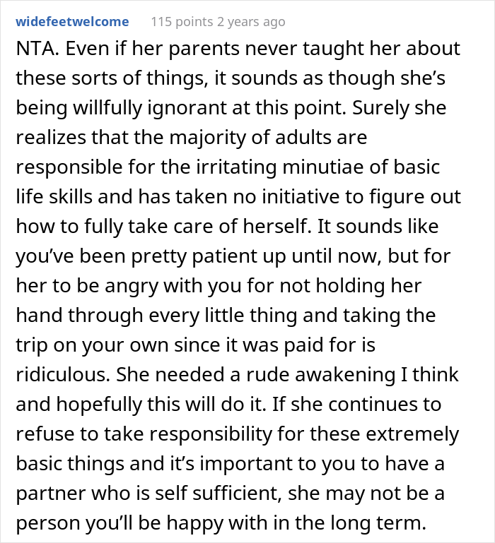 Tawayaitalifeskills’s post sparked a heated debate in the comments. After all, leaving your partner at the airport and going on a dream-like trip without them leads to many questions and a lot of eyebrow-raising. But most members of the AITA community determined the boyfriend was not in the wrong in this situation. Many criticized the user’s disorganized girlfriend for not taking any personal responsibility for her actions, despite being an adult who is successful in her professional life.