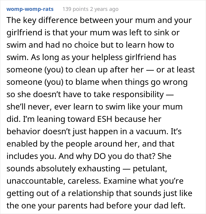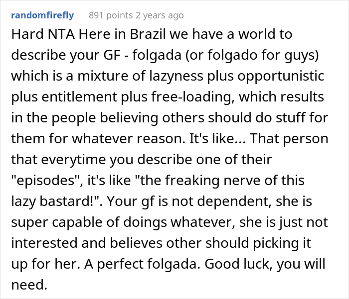 The young woman is notoriously irresponsible and believes her SO and loved ones exist in her life only to fulfill her needs. “Whenever she’s asked for help with something, what she really is asking for is for someone to take responsibility for the task,” the user wrote and was surprised to find out his girlfriend can be so out of touch with reality. Read on to find out how the story unfolded and weigh in on the situation in the comments!