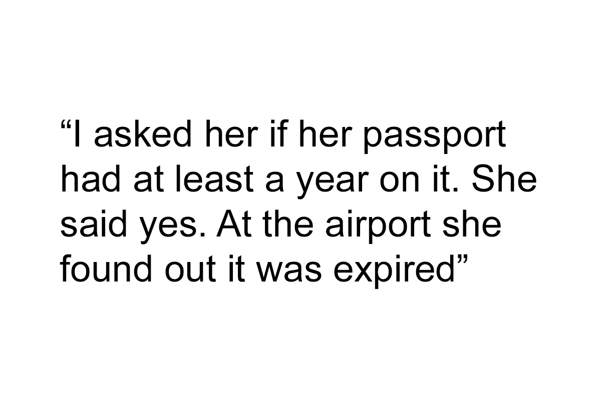 Load More Replies...As annoyed as I would be at my partner if they had let their passport expire I would be unable to leave them at the airport and just go and enjoy a vacation.