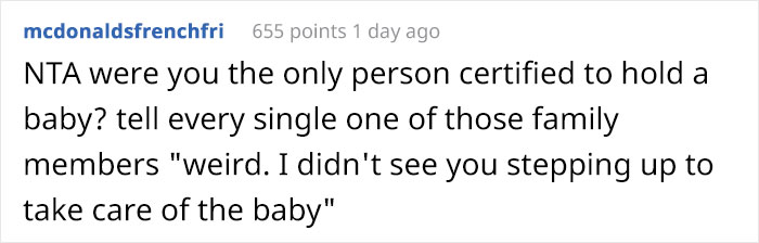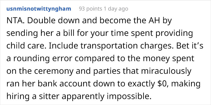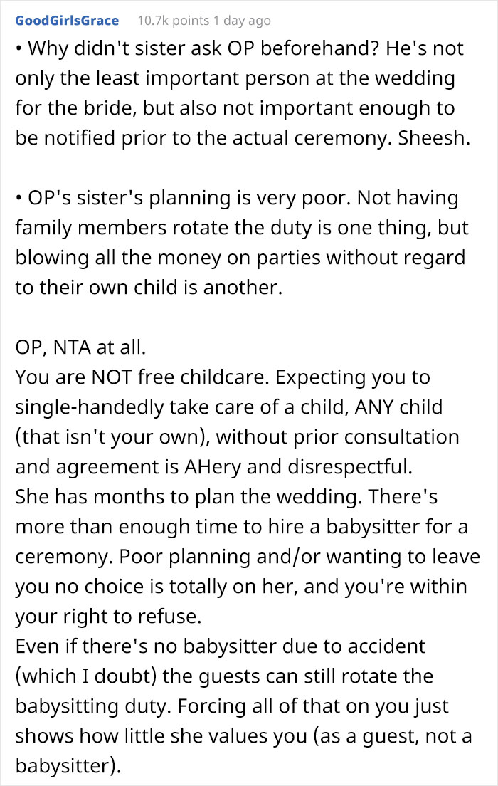In just one day, the author’s post has amassed 17.6K upvotes and more than 1.4K comments. Most of the commenters sided with the author, deciding he was not in the wrong in this situation. People said that other family members could have taken turns in watching the 1-year-old and that it was inconsiderate of the bride not to ask if OP agrees to babysit beforehand.