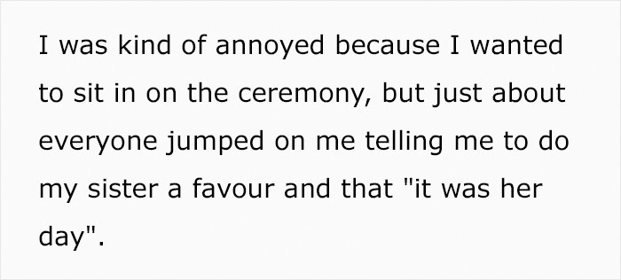 As you can guess, that didn’t sit well with the author. Feeling angry and annoyed that his sister wanted him to miss out on every important part of the celebration, the man slipped away and left. After being accused of ruining the wedding, he turned to the AITA subreddit, asking whether he acted like a jerk. Read on for the whole story.