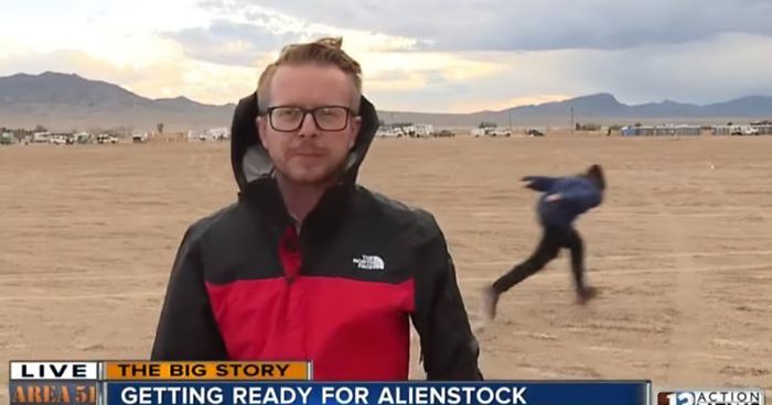 As the live reporter described the preparations for the festival near Area 51, a man did the infamous Naruto-run right past him
