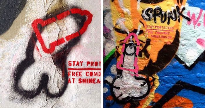 An anonymous street artist is doing a noble service to the many graffiti penises of London – by spray-painting condoms on top of them. It’s pretty hilarious, but it also sends an important public health message which we’re sure even the original authors of the graffiti would be cool with.