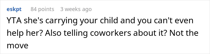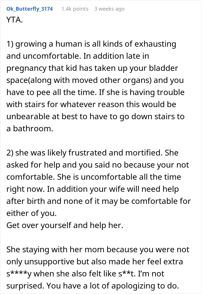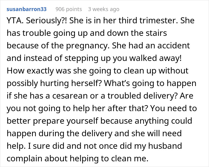 Load More Replies...Advice from the Auntie-brigade: You hug her, help clean her up, run upstairs for clean undies and pyjama. Run downstairs and help her into these. Gently help her get up those bloody stairs and put her to bed and say "I love you, it's ok sweetheart". You go downsairs and clean up the mess. Go back to bed and give her a cuddle. THAT is what you do for your wife who is carrying your child. YAdefinatelyTA.
