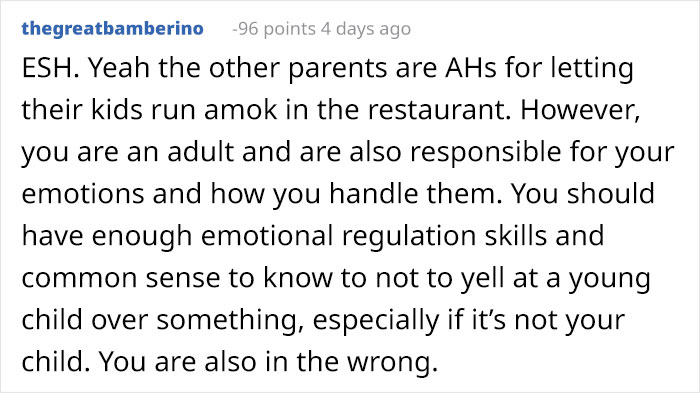 Load More Replies...NTA. I dont let my kids run around in restaurants - partly because of other diners comfort but mostly because its a health and safety risk for the serving staff. Tripping over kids with arms full of food and drinks would be hell. I would be mortified if my child climbed under someone elses table and while yelling might have been an overreaction it's also appropriate for my kids to learn that if they encroach on someone elses space they are likely to get yelled at.