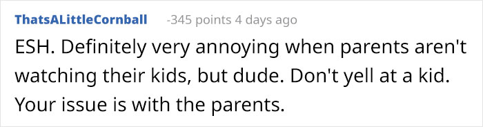 Load More Replies...Absolutely NTA, not even in the slightest. As others already mentioned, kicking whatever touches you from below the table is a normal reaction, so shouting is absolutely okay. The kid will remember this and won't do it again. There is a million things that can go wrong and can end with somebody getting hurt badly. I really don't get how someone can say ESH.