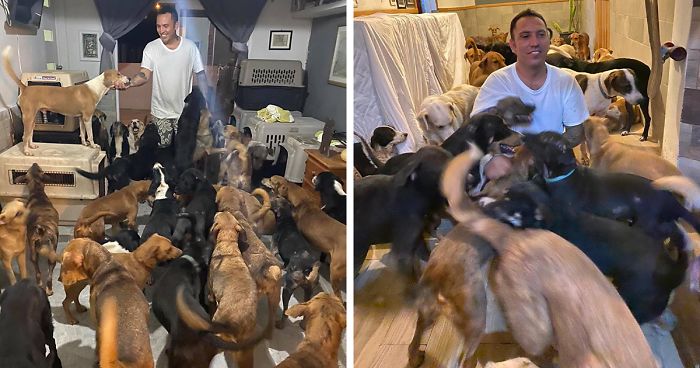 He told Bored Panda: “Those 300 dogs that I took into my house are some of the ones that already live at Tierra de Animales. It’s just that we don’t have enough hurricane-proof shelters for all the dogs, so to keep them safe from that, we decided to put them in the house.”