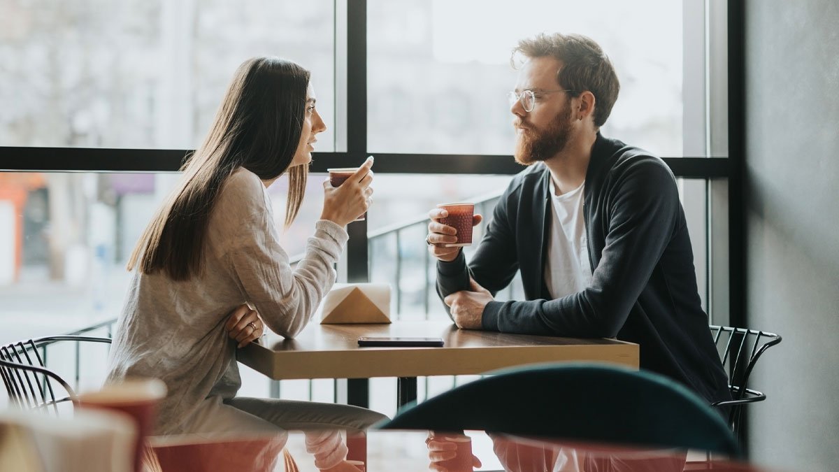 A man and woman on a tense first date in a cafe, illustrating a fake emergency gone wrong during the meeting.