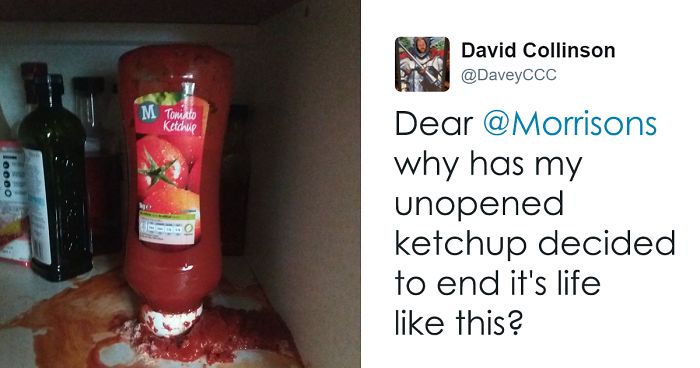 We don’t often stop to think about how things might affect the emotional balance of the produce in our kitchen cupboard. But when one man reached for his bottle of ketchup recently, he was shocked and saddened to find that his tomato sauce had committed suicide. Understandably wanting answers to this tragedy, the man, David Collinson, tweeted the supermarket where he’d purchased the ketchup before holding a service for his departed condiment. But that’s not the end of the story. Scroll down to see what happened when the supermarket responded…