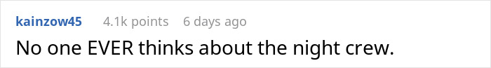 Load More Replies...Many people I know and interact with on a daily basis are swing or graveyard. If we want to spend any time seeing them, we have to be up at the same times. I respect everyone sitting around at 2 am just to hand me a burger or bag my items at a convenience store, and those of you that are working from 6pm-6am in factories. We see you and appreciate you! <3