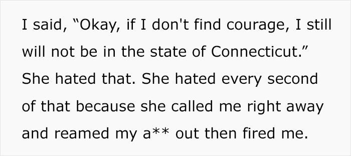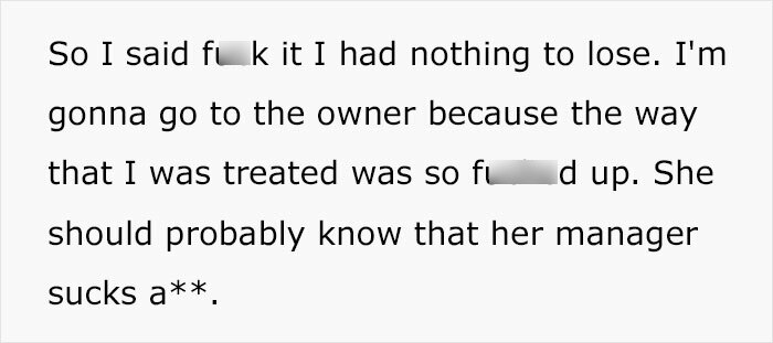In short, Arianna got fired after standing her ground over pre-planned paid time off, and told the owner about it, which got her job back and upset the manager