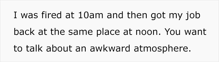 After some searching, she got a hold of the owner in person and told her what had happened, and that it was very unprofessional. So, getting fired at 10am led to getting rehired at around 12pm. Talk about awkward. But funny.