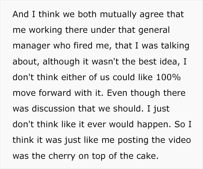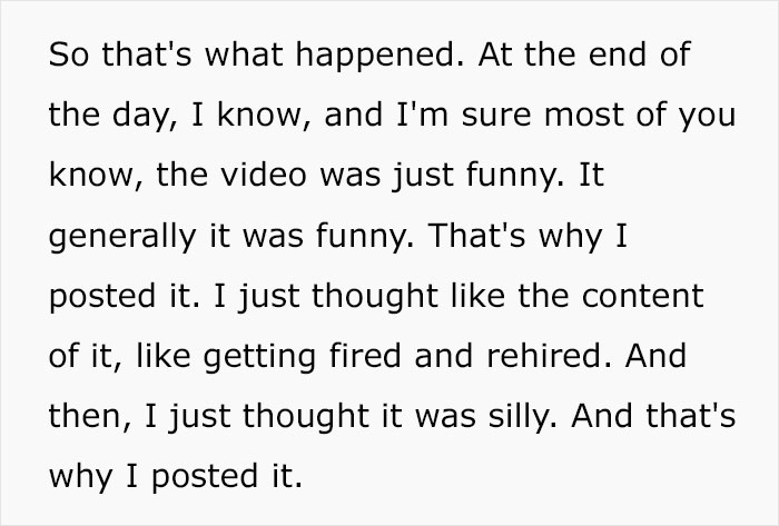 Load More Replies...What did she think was going to happen by posting a video on TikTok? I feel like a geezer when I see things like this. You literally s**t on your employer in a video posted for the world to see, and you get fired for it. Is this surprising? What happened to her was wrong, but she didn’t need to post a TikTok video. She did that purely for the internet likes.