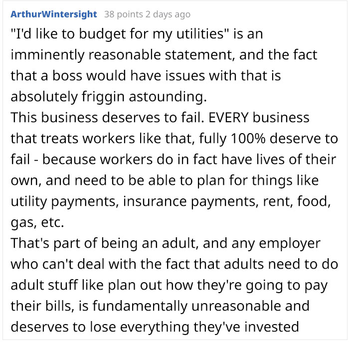 Load More Replies...How about..... we never talk about pay anymore..... in exchange, all our bills for everything (yes, including movie tickets) are addressed directly to the company.