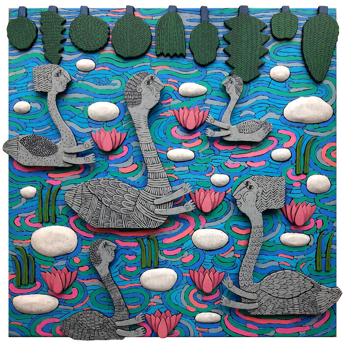 Marius's wooden works are often brightly colored, with the rhythm of his designs and his clear, bold color scheme making each piece stand out. Looking at his work, you can't help but dream of a peaceful, harmonious world. His art has a certain liveliness, a pulse that beats with the rhythm of life. Marius Jonutis shows us how wood, in the hands of a skilled artist, can become a vibrant and enchanting canvas.