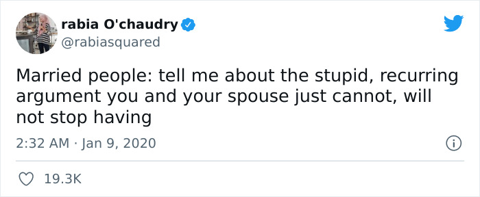 If Rabia Chaudry’s name sounds familiar, it might be because she’s the author of the New York Times bestselling book Adnan's Story. She has also amassed quite a following on Twitter where almost 202K users are engaged in what she has to say and, luckily for us, share their own funny and genuine stories. The post in question, which has received over 19K likes, proved that couples all over the world get peeved off by the most foolish things.