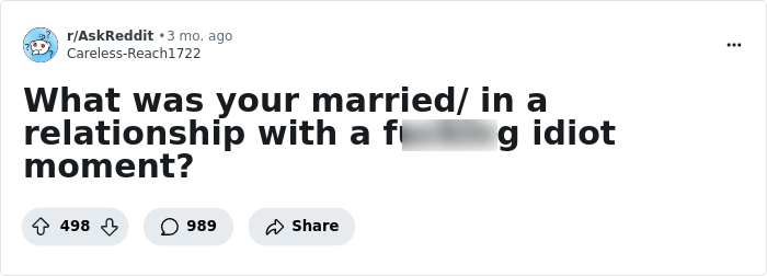 Interview With ExpertWe all have our moments, and some are less fortunate than others. However, Reddit user Careless-Reach1722 wanted to cut through the surface level and asked everyone on the platform to describe the moment they realized their partner was an absolute fool.