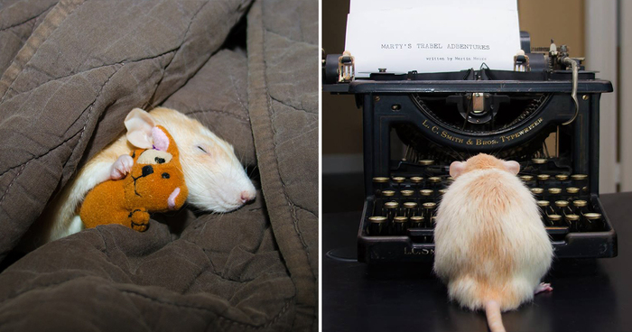 Meet Marty Mouse, which isn’t truly a mouse, just like Virginia Wolf isn’t truly a wolf. He is actually an adorable little dumbo pet rat. Marty Mouse was rescued from a pet shop in 2013 where he lived alone in a plastic box. Now he has a loving home where his owners stay with him all day, letting Marty take his little rat adventures around the house anytime he wants.
