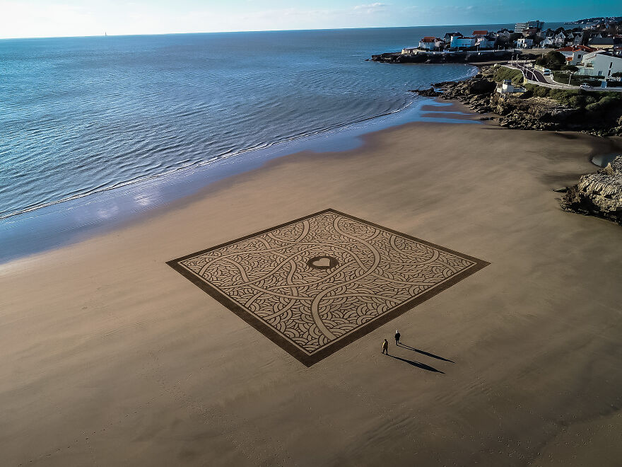 I'm Jben and I have drawn massive designs on the beach since 2013 using rakes. I'm located on the French West coast in Royan where I have lots of different beaches to use as a canvas for my art.