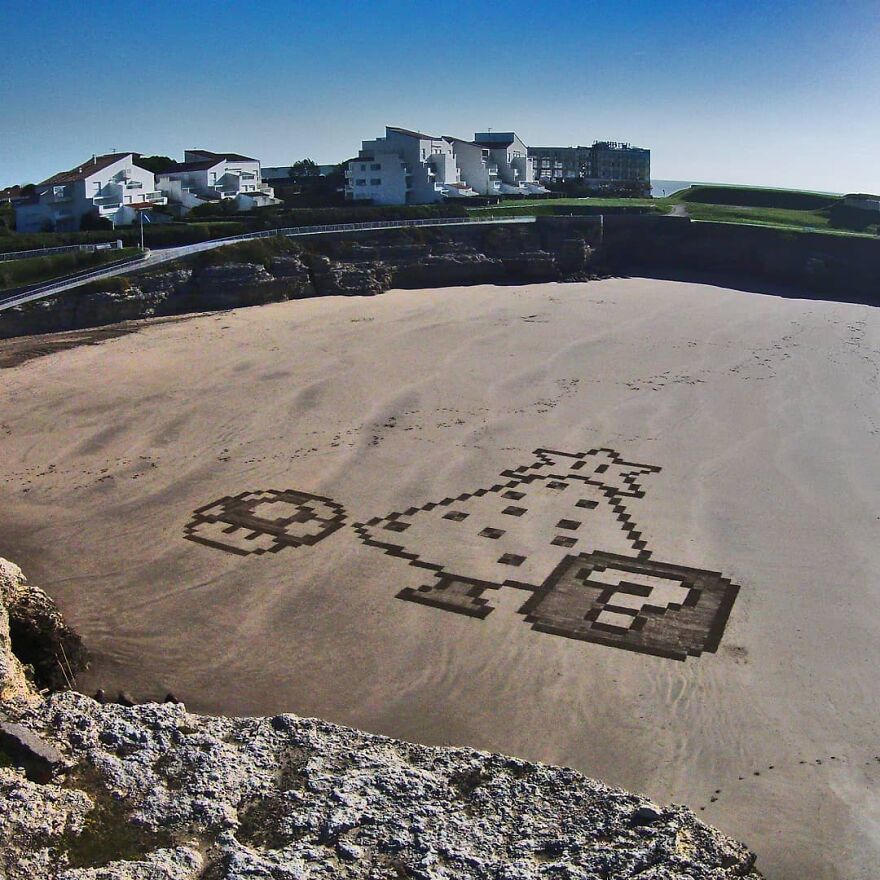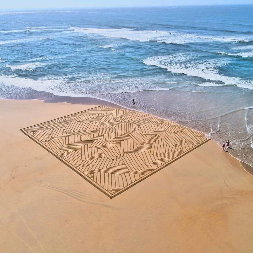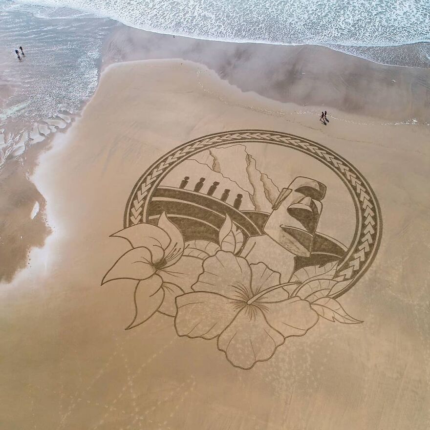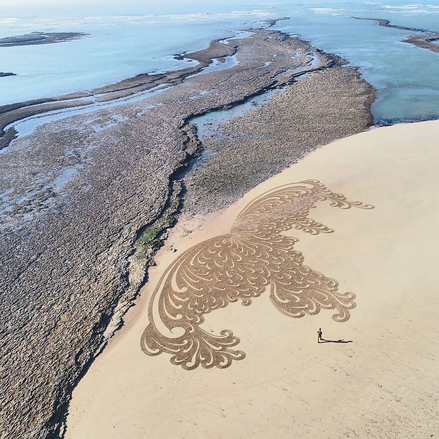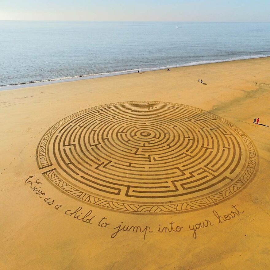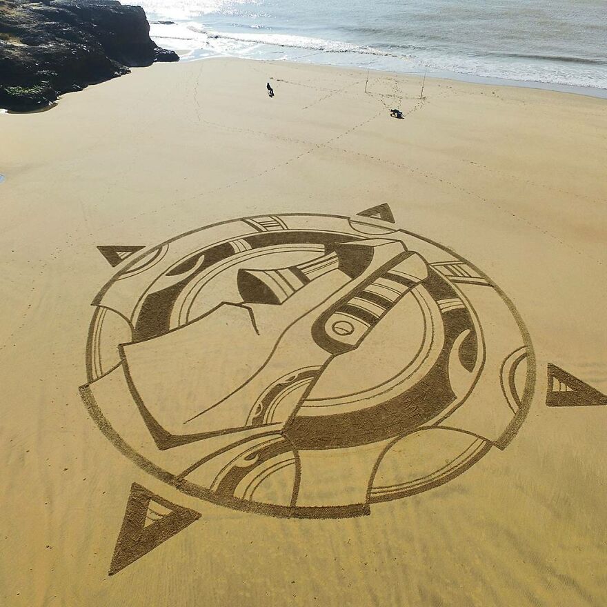 I'm Jben and I have drawn massive designs on the beach since 2013 using rakes. I'm located on the French West coast in Royan where I have lots of different beaches to use as a canvas for my art.