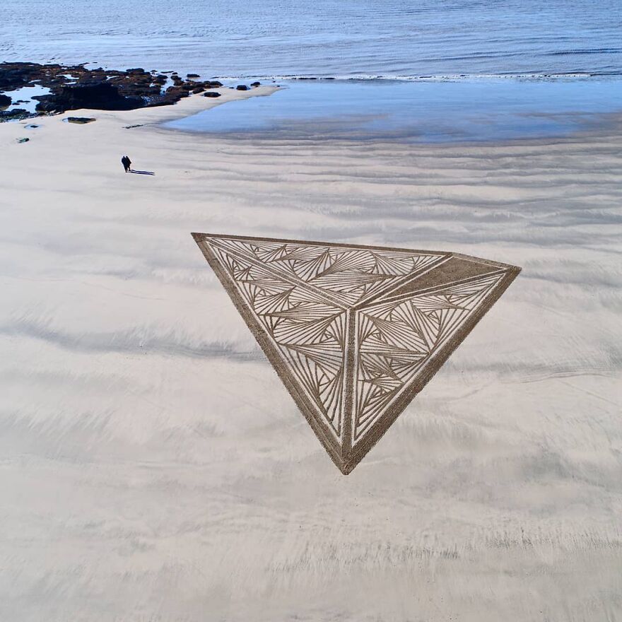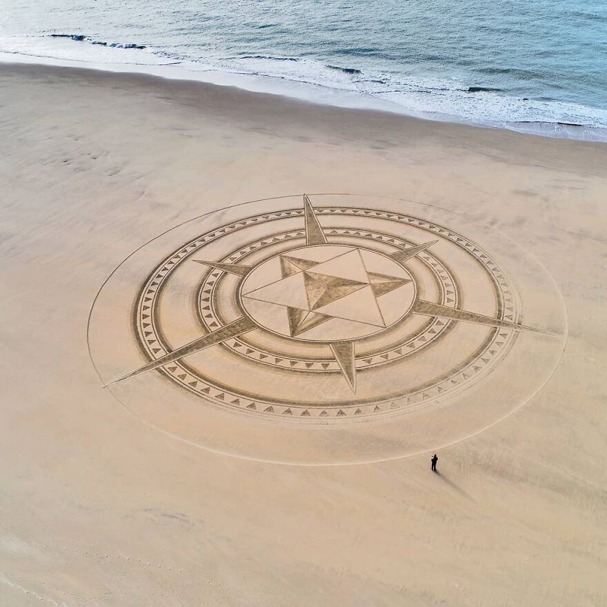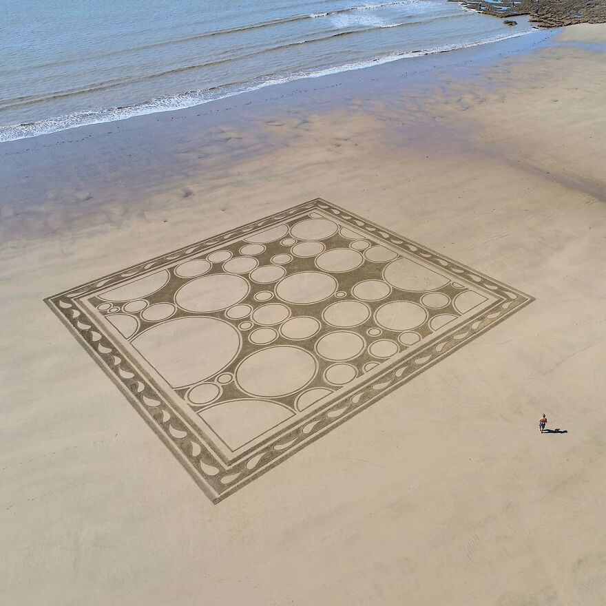 Utilizing a drone, I capture overhead shots of my expansive beach designs; while many assume I use it throughout the process for verification, the truth is I only deploy it at the culmination to immortalize my creations. Given the constraints of time and tide, the designs vary in size, ranging anywhere from 30 to 100 meters wide, with their dimensions influenced not just by their intricacy but also by the ever-shifting rhythms of the ocean, a constant reminder of the impermanence of my art.