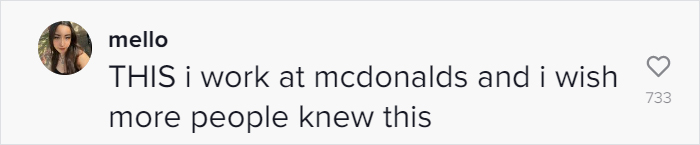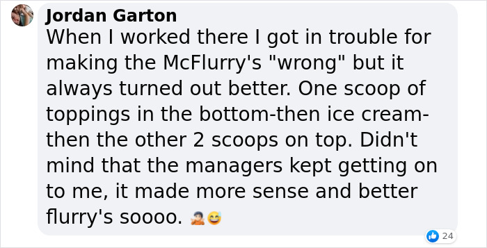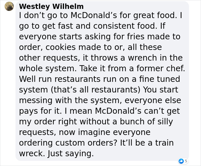 Load More Replies...None of these is valid outside of the US, and most are not true even in the US. In my country McD allows customization within strict limits (BK is far more permissive), water only comes as bottle, ice cream being broken down is very unusual and changing the oil once a week or re-frying cold food would get the location shut down by authorities pretty fast.