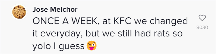 Load More Replies...Dude who claims KFC changes their fry oil "Every Day", I'm calling BS. There's no reason to change the fry oil every day. Even the busiest places do it at most twice a week.