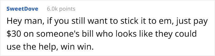 Load More Replies...This may be off topic but not taking breaks or eating is so unhealthy for you. Even if a diner/restaurant didn't have healthy choices, you could go to a super market and maybe get a ready made salad. Even the hotels have food you can order. Plus tossing food to be spiteful is such a waste.