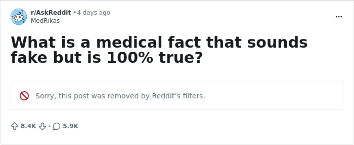 That’s exactly what happened when one Redditor asked users to share medical facts that sound completely fake but are actually true. People delivered with some genuinely strange and interesting stuff, and we’ve pulled together the best responses below. Scroll down and see which ones surprise you.