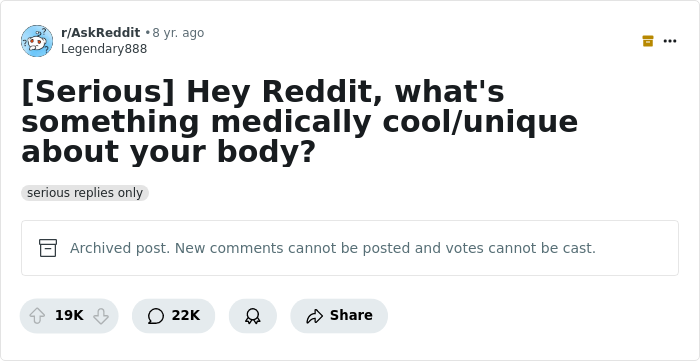 The selection we present to you today is based on this viral, albeit, quite old thread from the AskReddit community, where the user u/Legendary888 once asked: "What's something medically cool/unique about your body?" In full accordance with the username of the thread starter, it turned out to be legendary, eventually gaining over 19K upvotes and 22K different comments.