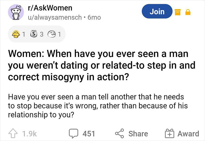God I've been trying so hard to think of an example. I have a couple of male friends (a trans man and gay man) that I think would stand up and correct misogyny but haven't seen it because we don't hang out in any situation that would have someone misogynistic around. My gay latin teacher has stopped many misogynistic things from happening, including chasing away men that harassed me on our school trip. I can't think of a single cis straight man that's stepped in. I remember once on that same school trip, I was buried in sand on a beach and my female friends were getting water and a male friend of mine just stood by and watched as another guy felt me up (I couldn't move bc of the weight of the sand, only my chest and face were still unexposed). I remember I cried for my male friend to make the other guy stop and he just was like "bro stop it" and then the other guy stopped for a second and then got back to it, male friend didn't make any other effort, just shrugged. My female friends came back and pulled me out of the sand and dragged the other guy away and helped me approach him later to tell him that if he ever tried to touch me, even just my shoulder, that I would break his nose. Later the girls and I ignored him the rest of the trip, the boys knew what happened and were still friendly with him despite claiming to be my friends. My friends mom was a parent chaperone and told us we were being cruel and to stop excluding him. The teacher chaperone had seen the original situation happened and didn't step in. (These chaperones were not from my school, but from a different school also on the trip). I regret not telling my teacher that I mentioned before. But I was 16 and embarrassed.