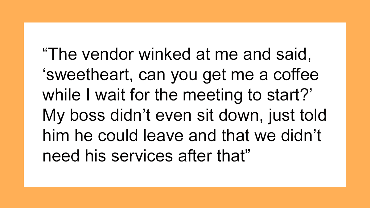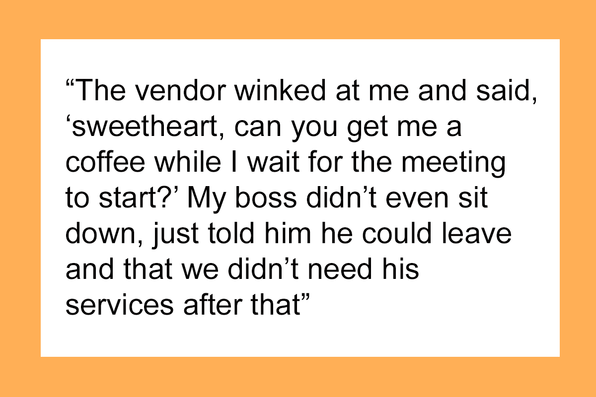 30 Times Men Stepped In And Called Out Guys For Harassing Women I work in finance. My first day of my first ever internship, we had a product vendor come in for a meeting with my (male) boss, and my boss decided to invite me to see how I handled it. Fortunately, my boss joined us at the conference table at just the moment when the vendor winked at me and said, “sweetheart, can you get me a coffee while I wait for the meeting to start?” My boss didn’t even sit down, just told him he could leave and that we didn’t need his services after that.