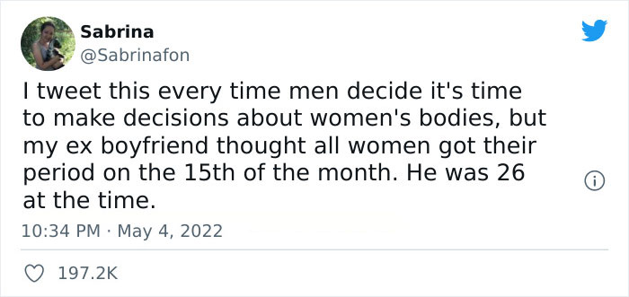 Sabrina Fonfeder, a development executive, noted that men should not make any decisions about women’s bodies, and gave an example of how little about biology some men know. One of her exes, for example, thought that all women got their period on the 15th of the month. The tweet quickly went viral and other women pitched in with similar horror stories.