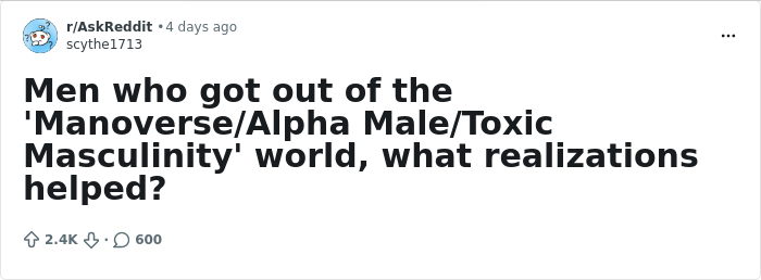 Luckily, some men do see the light eventually and break away from consuming that kind of content. Some spot the red flags almost immediately; others take some months or years to realize, "Hey, I think this is BS." Recently, men shared these eye-opening moments in an online thread where one netizen asked, "Men who got out of the 'Manoverse/Alpha Male/Toxic Masculinity' world, what realizations helped?"