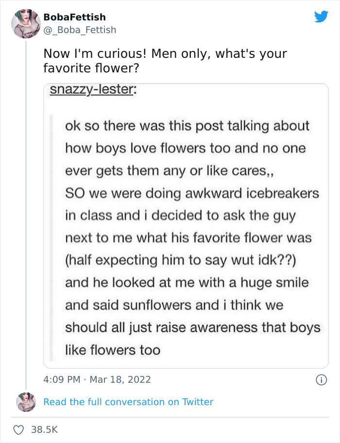 Twitter user BobaFettish realised that after finding a Tumblr post which told a story of asking a boy what his favorite flower was as an icebreaker. The author of the post thought they would be mocked for asking such a question, but were pleasantly surprised to see that the boy actually gave a serious answer.