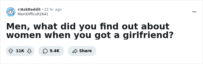 Moreover, what is interesting is that we don’t know much not only about a specific person, but also about the other gender in general. And the popularity of various online threads, where men and women exchange their own misconceptions, is further confirmation of this. For example, this thread in the AskReddit community, with 12K upvotes and nearly the same amount of comments in just two days.