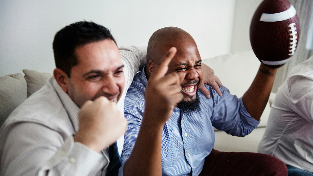 Two men celebrating excitedly on a couch while one holds a football, illustrating struggles men explain to women. Why I don't know what the f**k my best friend is up to in life even after hanging out with him all day.