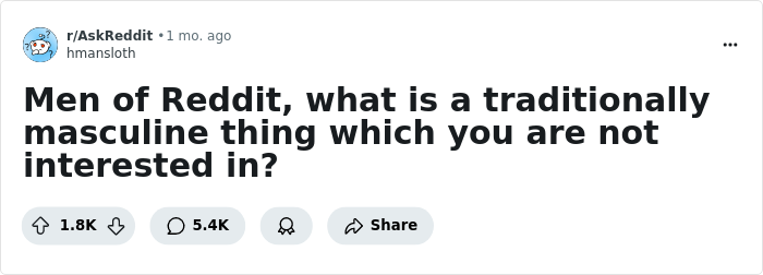 The original thread appeared in the AskReddit community about a month ago, when the topicstarter asked male netizens: "What is a traditionally masculine thing which you are not interested in?" As of today, the thread has around 1.8K upvotes and almost 5.5K various comments. As we can see, the discussion was quite lively, and not all the ideas presented by the thread participants were unanimously approved by others.
