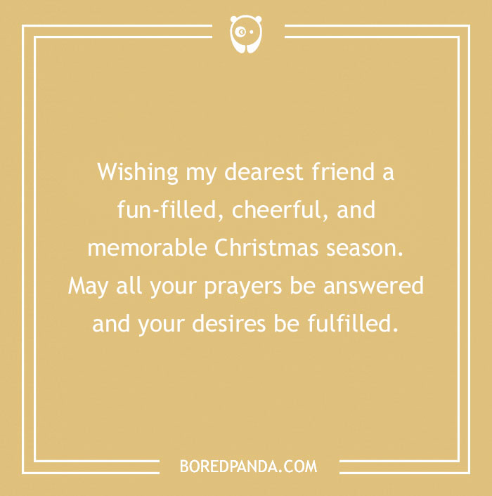 Wishing my dearest friend a fun-filled, cheerful, and memorable Christmas season. May all your prayers be answered and your desires be fulfilled.