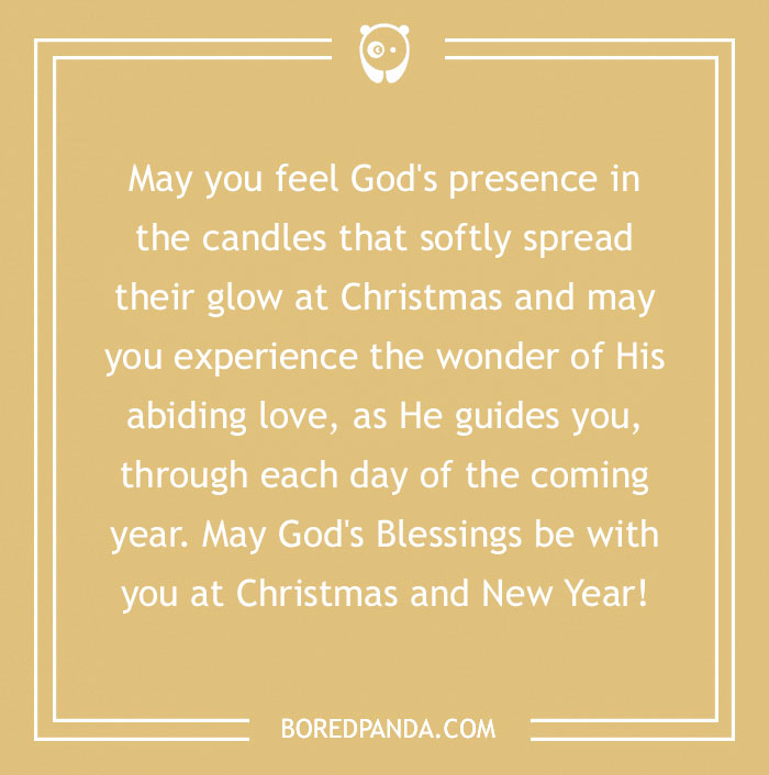 May you feel God's presence in the candles that softly spread their glow at Christmas and may you experience the wonder of His abiding love, as He guides you, through each day of the coming year. May God's Blessings be with you at Christmas and New Year!