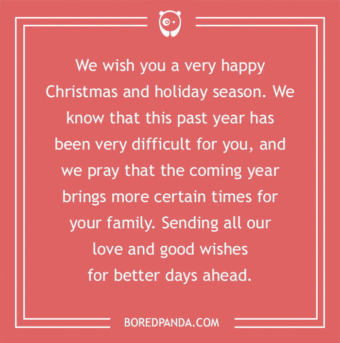 We wish you a very happy Christmas and holiday season. We know that this past year has been very difficult for you, and we pray that the coming year brings more certain times for your family. Sending all our love and good wishes for better days ahead.
