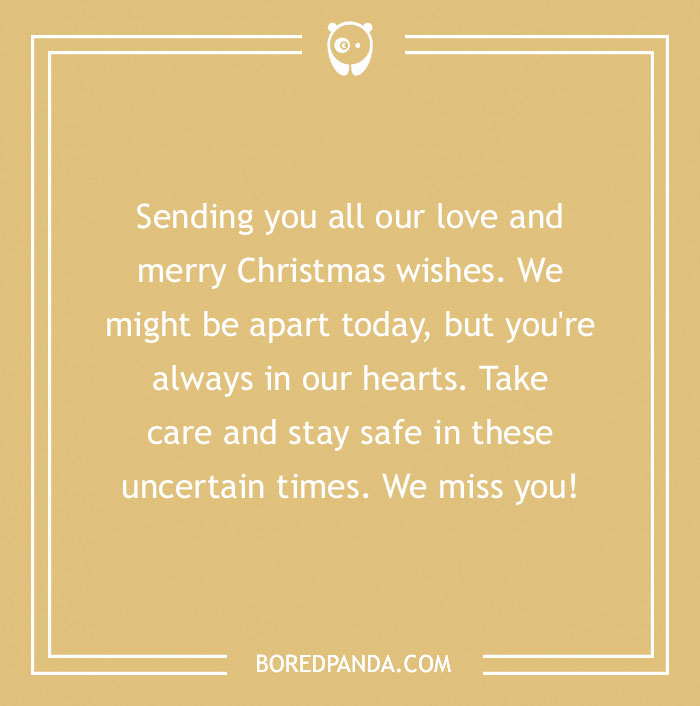Sending you all our love and merry Christmas wishes. We might be apart today, but you're always in our hearts. Take care and stay safe in these uncertain times. We miss you!