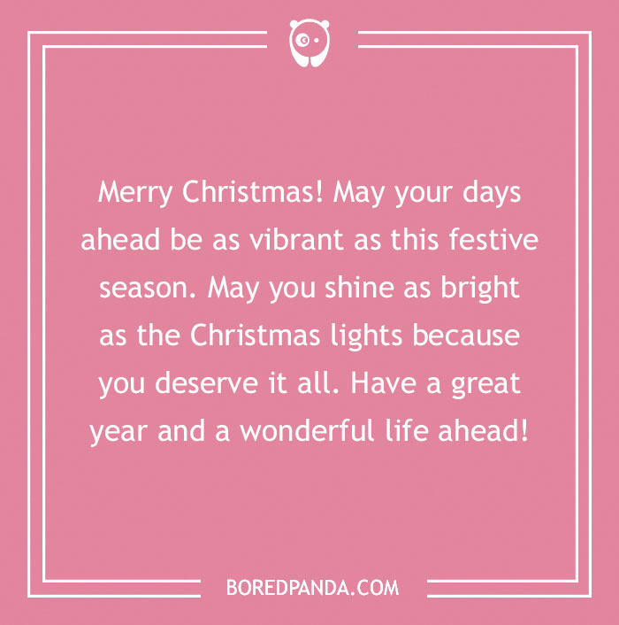 Merry Christmas! May your days ahead be as vibrant as this festive season. May you shine as bright as the Christmas lights because you deserve it all. Have a great year and a wonderful life ahead!
