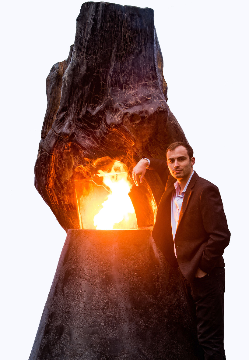 Though wood comprises its sole composition, the material does not burn. It instead takes on the traditional characteristics of stone, both in functionality and aesthetics. The specimen obtained to create Ascendance comes from a low-land tropical tree species (Dipterocarpaceae) indigenous to central Indonesia and is estimated to roughly 22 million years old. A custom concrete base has been constructed with a hollow core which houses an low-voltage natural gas burner, controlled by remote control or Bluetooth compatibility.