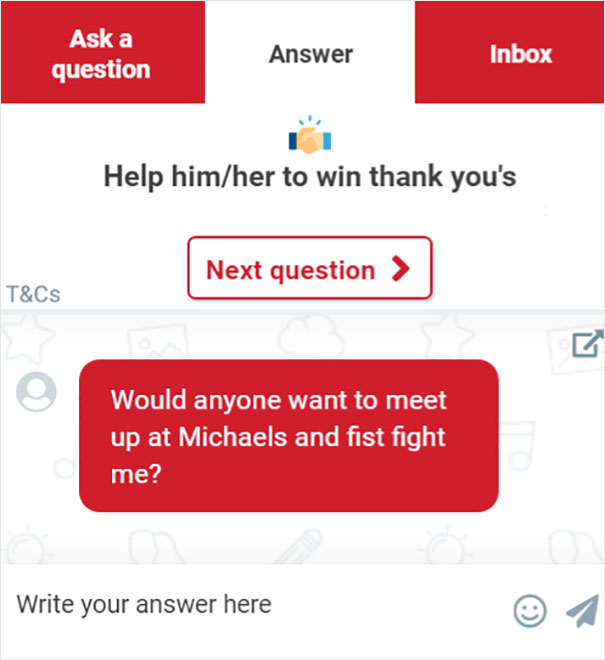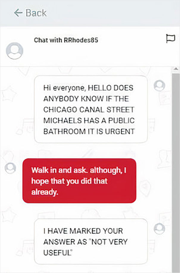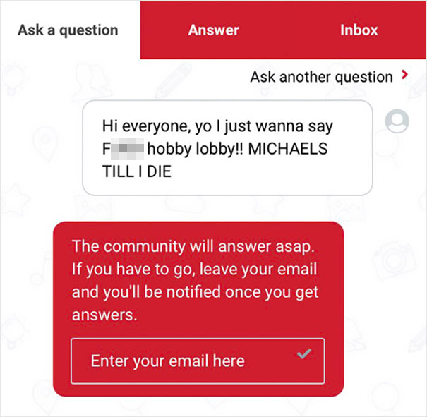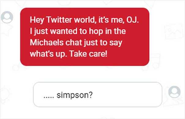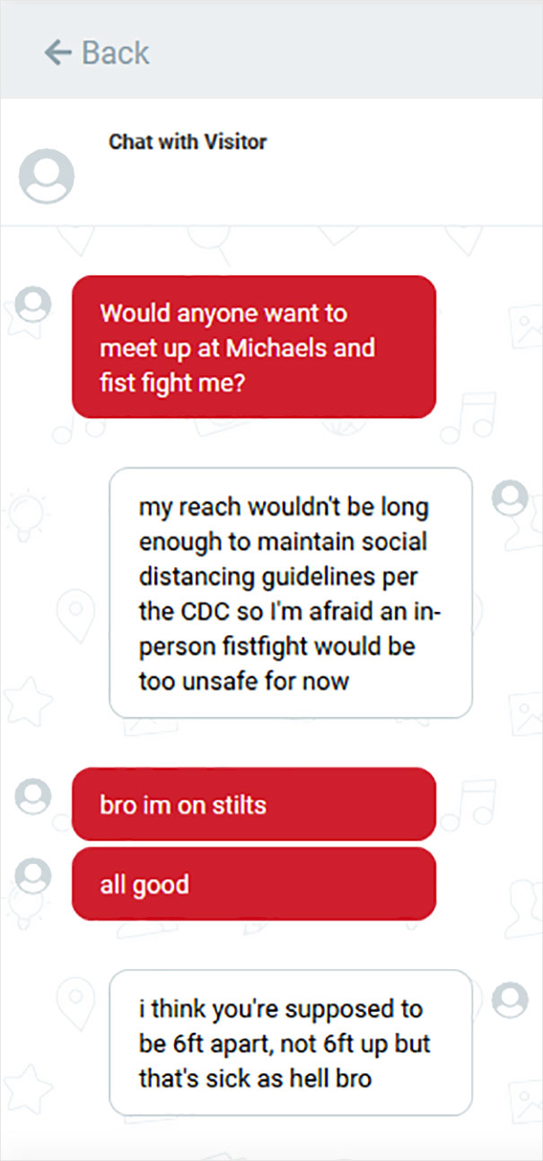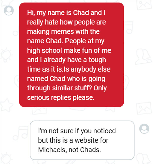 Another great thing about Michaels is that, apparently, their online store has a live chat feature to it. In it, you can message other like-minded, crafts-obsessed people. Naturally, as soon as Twitter found out about this, they've been having a blast chatting: "The Michaels website has a feature where you can chat live with other Michaels shoppers and it’s changed my life," Twitter user LouBegaVEVO wrote in a now-viral post. Little did he know that one hilarious screenshot of a Michaels chat would amass more than 160k likes in almost no time and would prompt other people to share their gems from the messaging feature as well. Scroll down below to see the screenshots that Twitter users shared and vote for the ones that made you laugh!