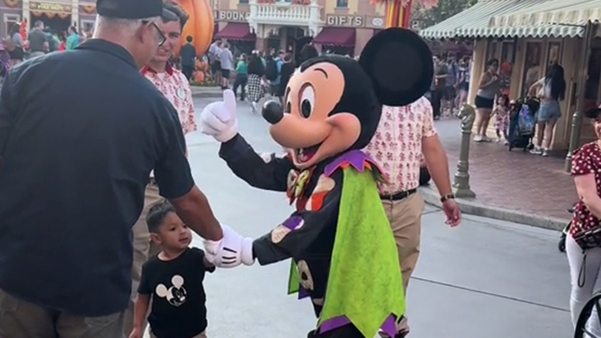The video captures Mickey Mouse gesturing to the man that he should have been watching his kid instead of using his phone, making sure the kid was okay, and then casually walking away while people around were watching.